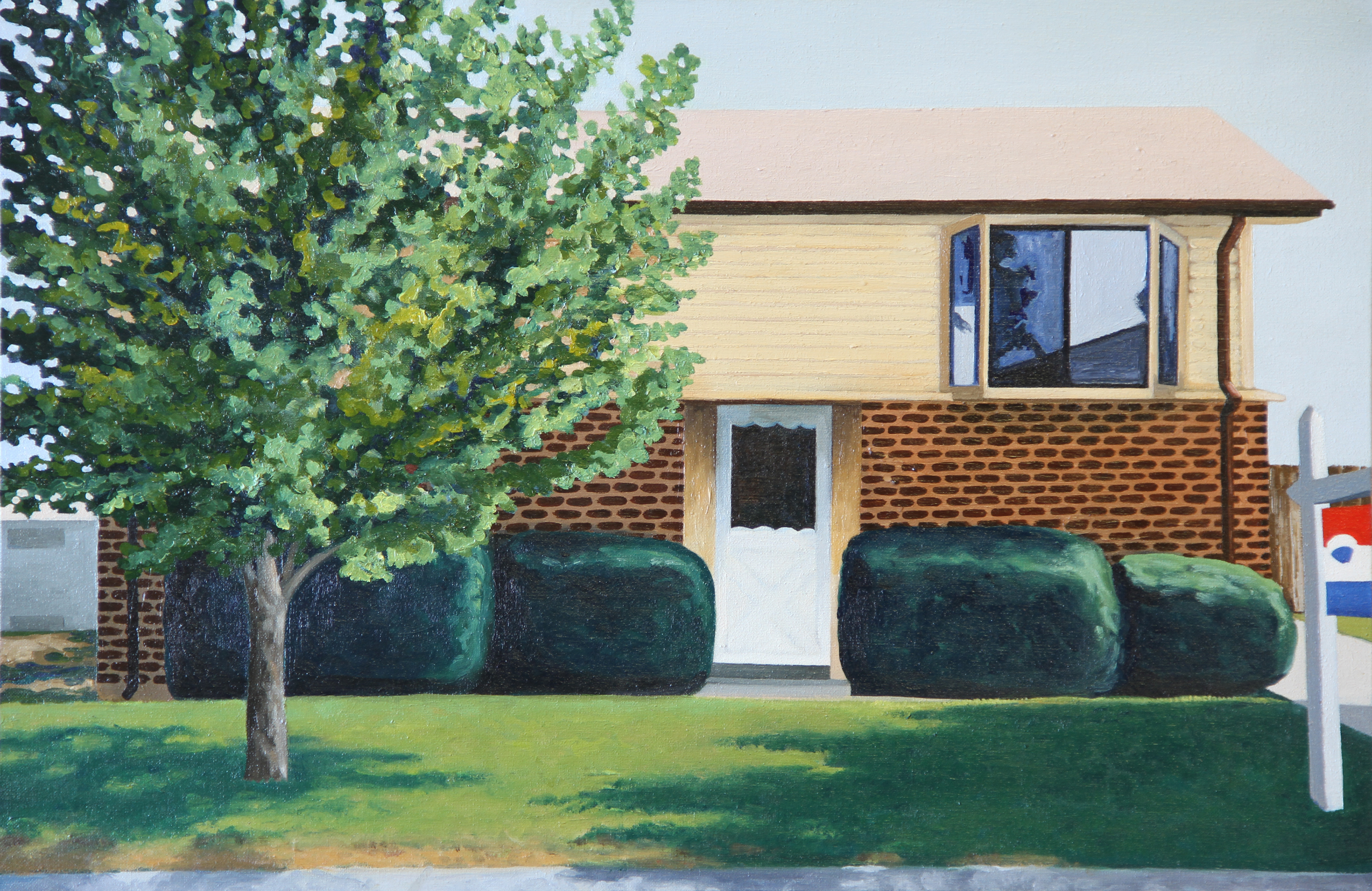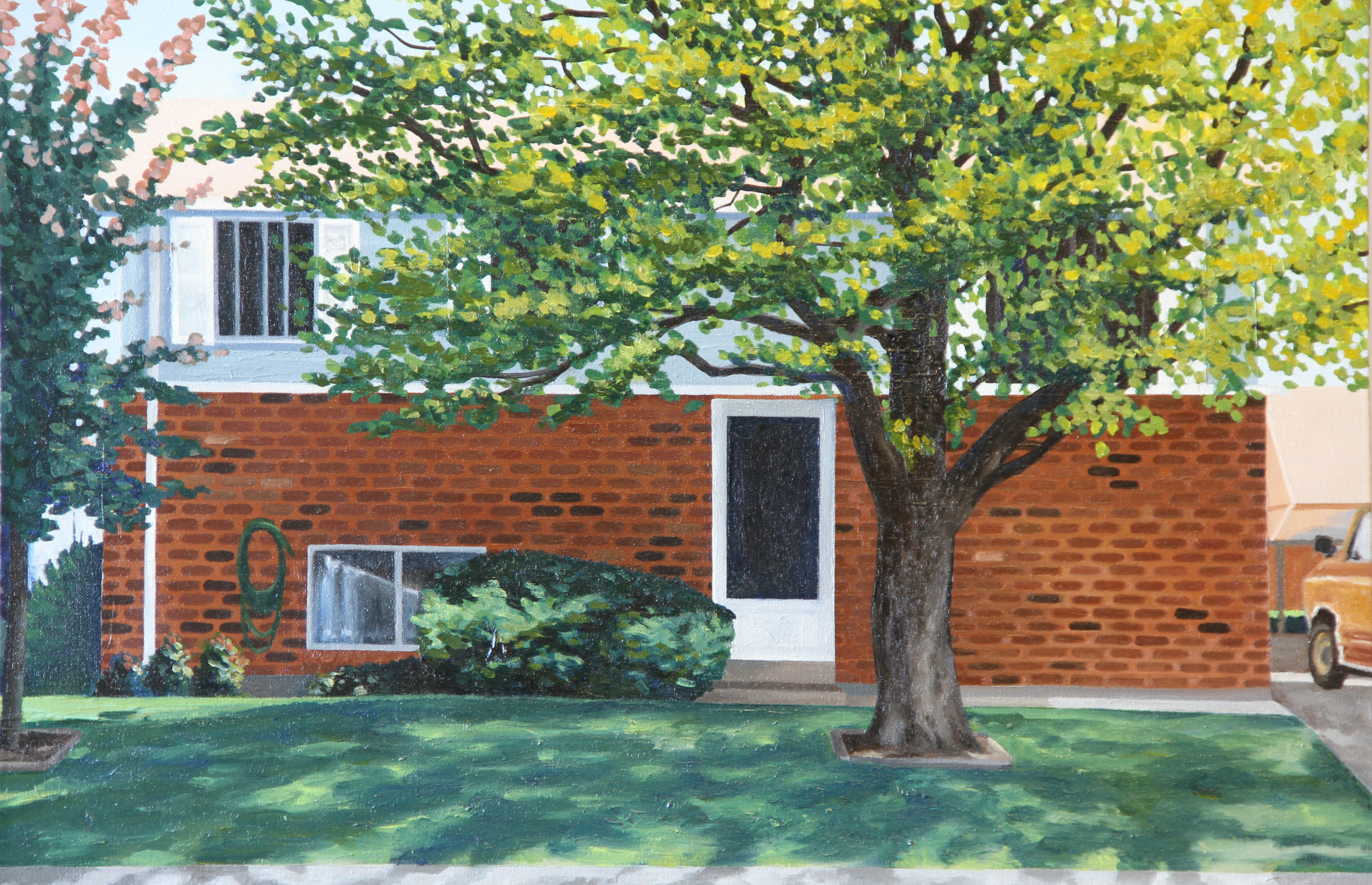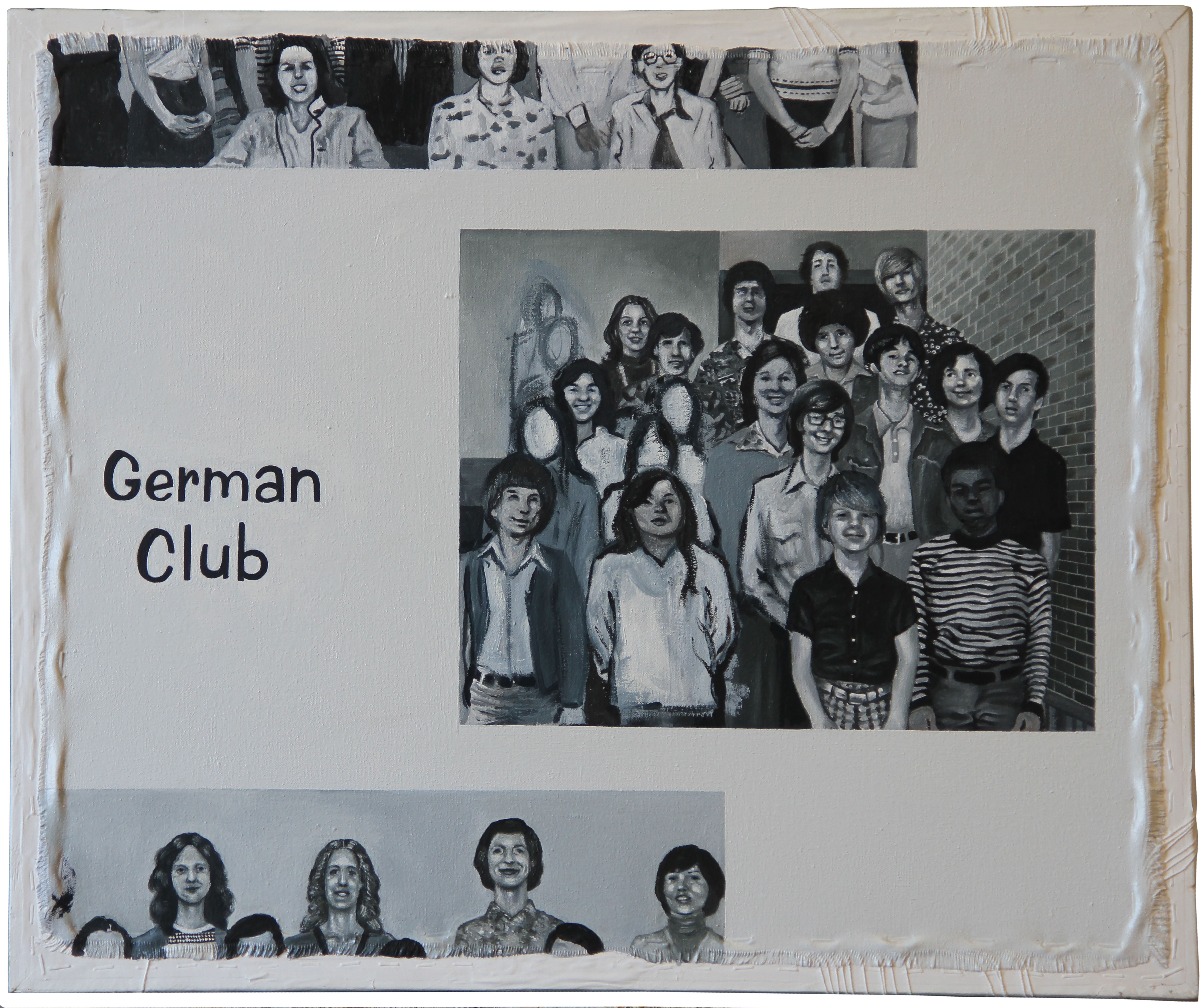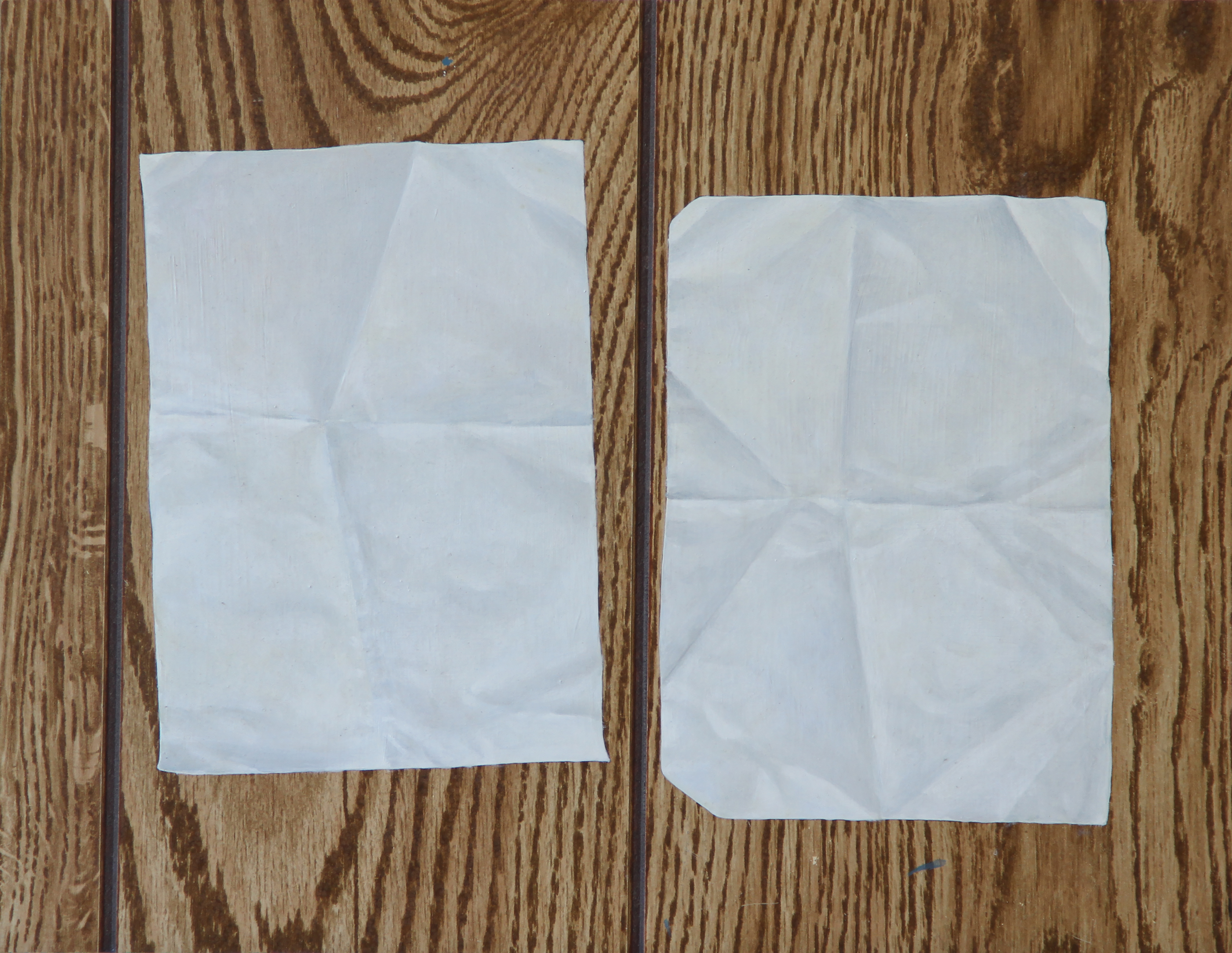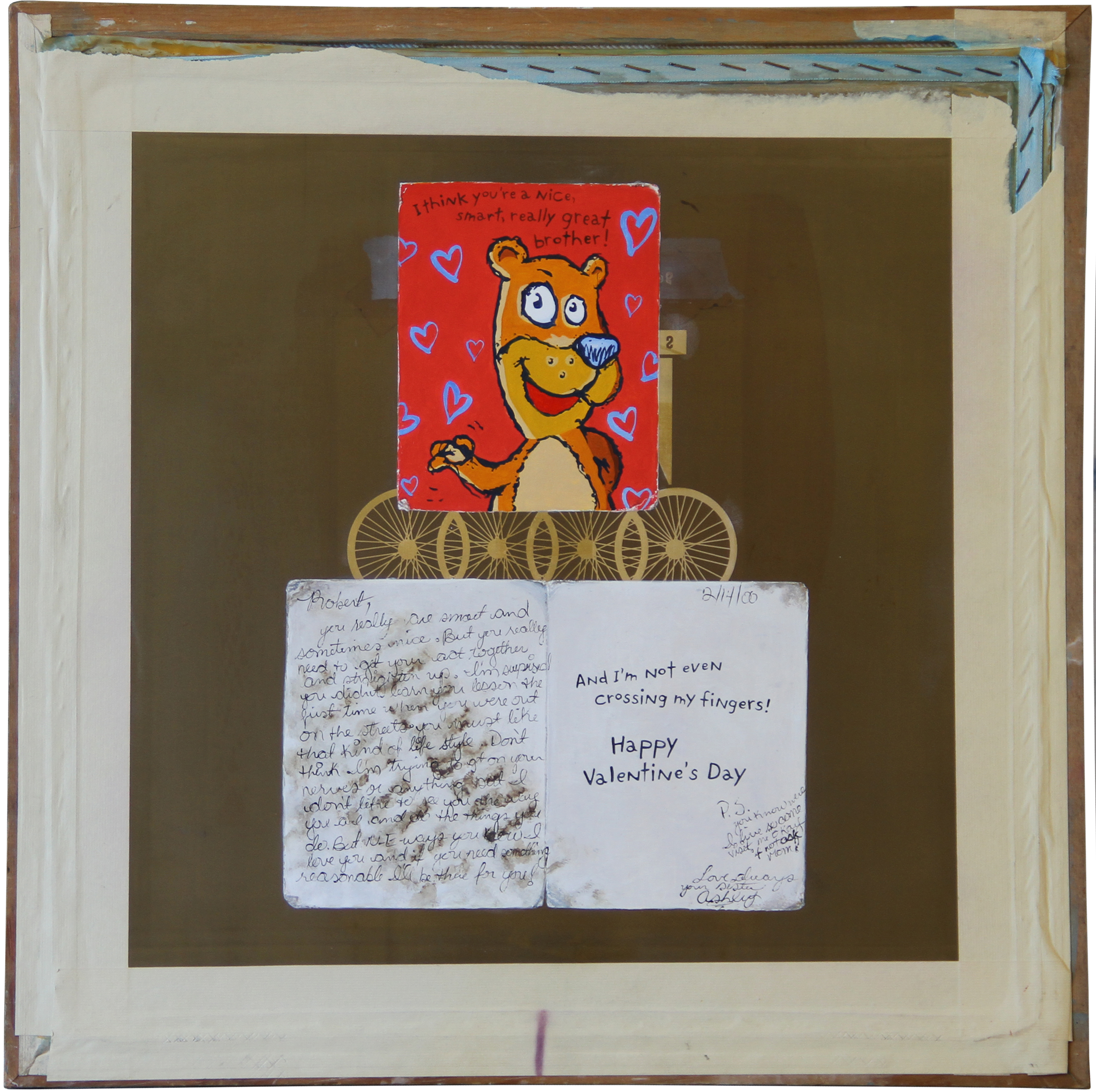 A run over birthday card. A perfumed love letter. Torn-up photographs. I found these things on the ground, took them back to my studio and painted reproductions of them on other found objects: discarded silkscreen frame, kitchen cabinet drawer, flower-patterned fabric, and wood grain paneling.